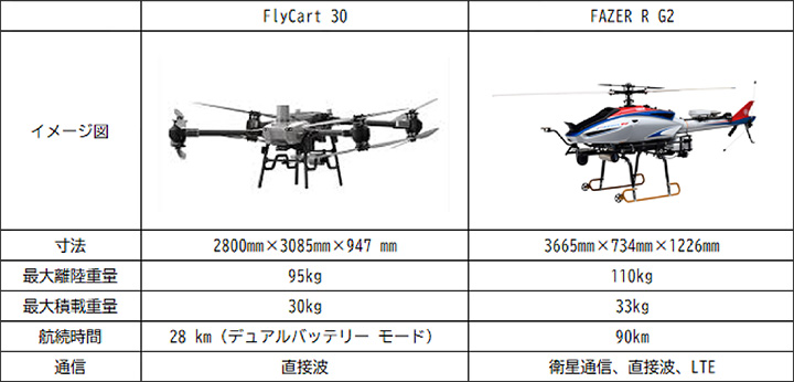 これまでの無人ヘリコプター「FAZER R G2(当社愛称「きびたき」)」に加え、DJIから今年発売された電動マルチコプター「FlyCart 30」を活用することで、お客様の多様なドローンによる輸送ニーズにお応えします。