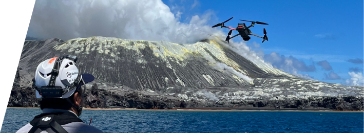 遠隔での空撮、火山礫や海水の採取、データロガーの設置・回収、ローバー(無人探査車)の運搬・現地での改良など、JDRONEはドローンを活用したさまざまな取り組みで調査を支援しています。